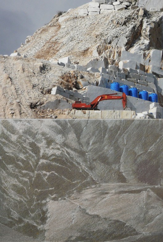 Digital photo of Carrara Marble Quarry “Canalgrande” from distance (above) and white pencil drawing on dark Canson paper A4 surveying the existing mountain which is being destroyed (below).