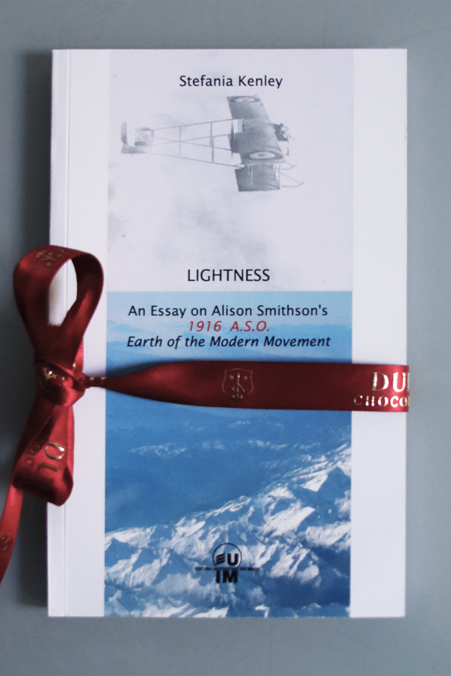 Digital image of a package (made with “Durig chocolatier” ribbon) of my book: Lightness, an essay on Alison Smithson’s ‘1916 A.S.O. Earth of the Modern Movement’, Ion Mincu University Press, 2014
