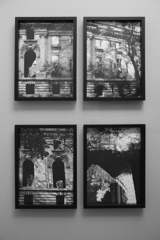 A4 photographs, printed from 35mm Agfa film, that I took with a Praktica MTL 50 in October 1985 in the ruins of Cantacuzino Palace in Floresti Prahova, Romania; today I re-photographed them as a group of 2×2, displayed on a surface 80×53,3cm, in black wooden glass frames.