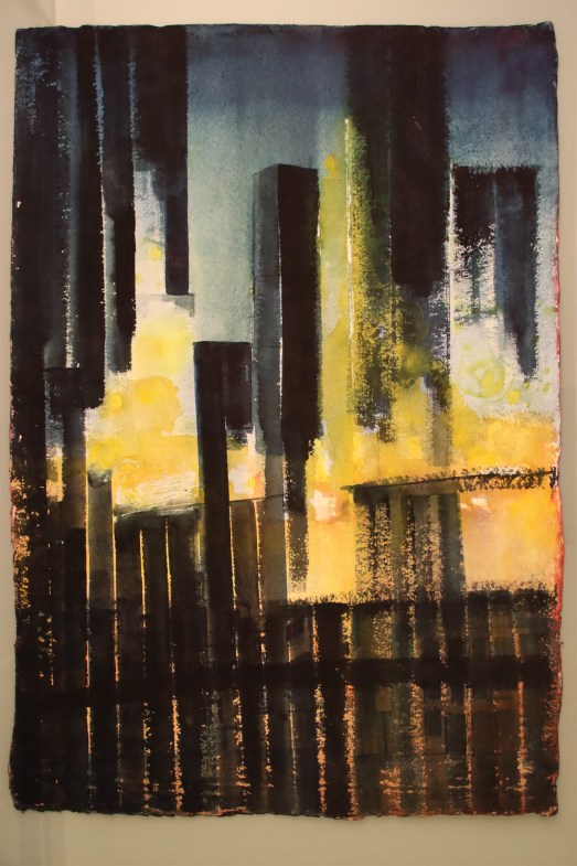 Painting suggesting an oppressive urban development with dark primitive underground. Black ink and watercolour on Khadi paper with uneven edges of max 105x72cm, photographed on a surface of 120x80cm.