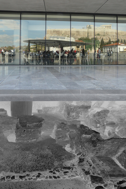 Above – entrance and the double level gallery of the Archaic period and restaurant offers a view on the Acropolis. The floor above, destined to receive back the original Elgin marbles is at the same level as Parthenon itself.