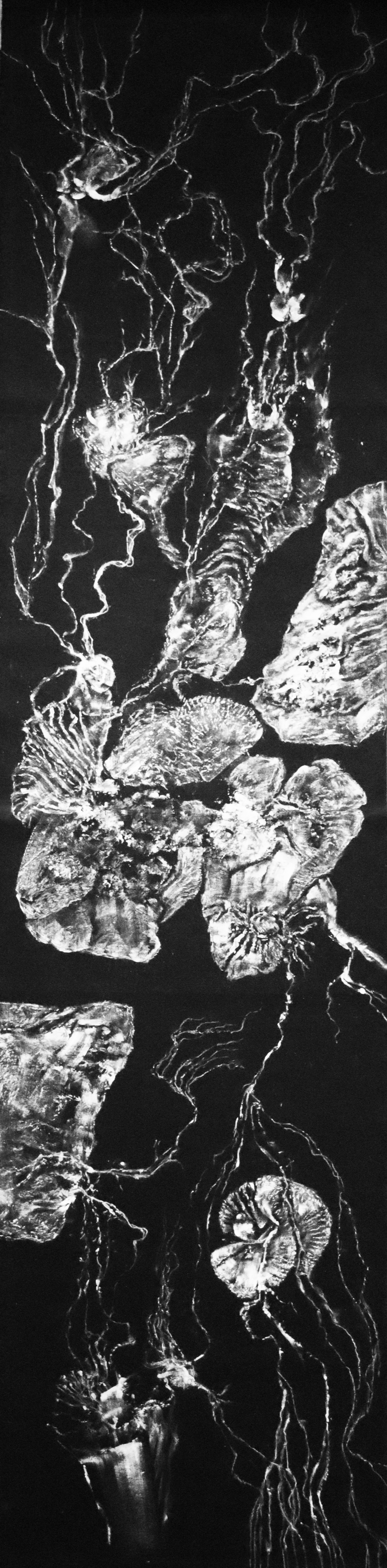 Original size at 1480 × 6000 Leave a comment Fossils, 2023, empreinttage, white pencil and oil imprints on black fabric 150x40cm