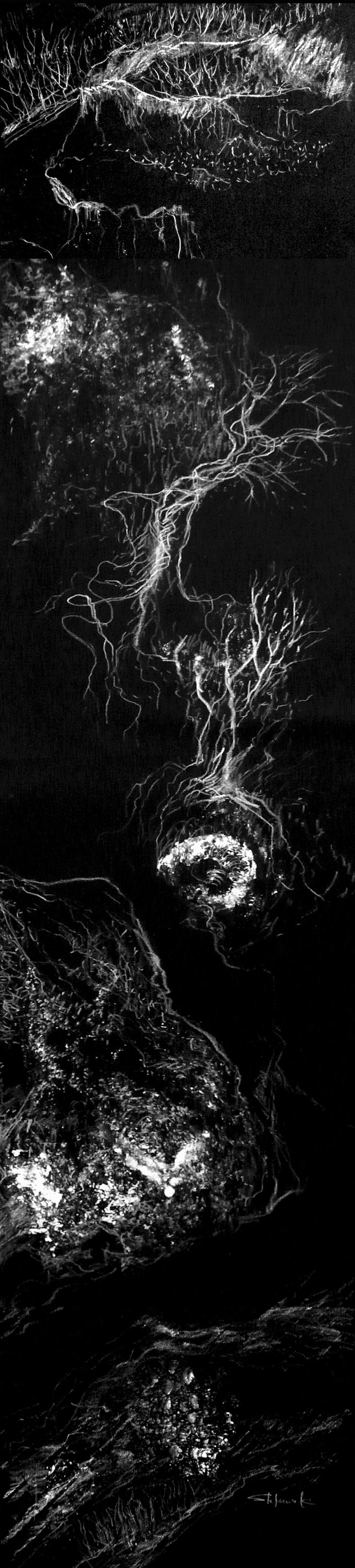 Imprints Original size at 643 × 2835 Leave a comment Roots & twigs, 2013, empreinttage, white pencil & oil imprints on black fabric 150x35cm Like Loading...