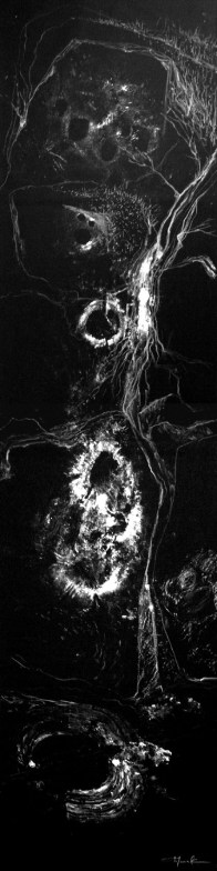 Imprints Original size at 425 × 1701 Leave a comment Roots & fossils, 2013, empreinttage, white pencil & oil imprints on black fabric 150x40cm Like Loading...
